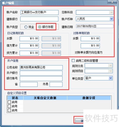 6、 开设银行账户时,先选择银行存款类型,然后填写相关信息。注意,日记账期初余额必须与对账单期初数一致。