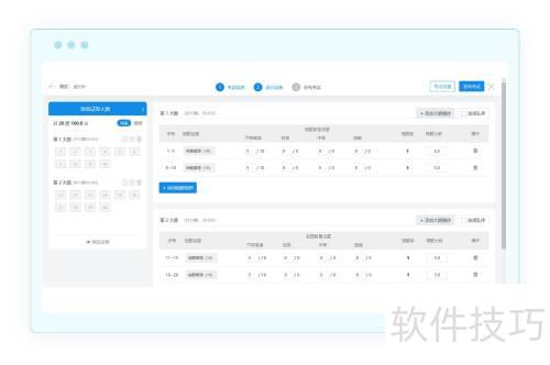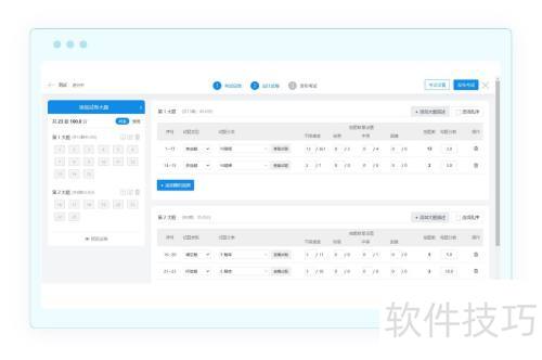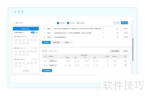 2、 抽题试卷功能支持创建大题并添加抽题策略。可通过试题管理容器从题库中选取已有试题,或新增单个、模板导入及批量添加新试题。同时,可设置不同难度试题的抽取数量与每题分值,从而实现智能化组卷。