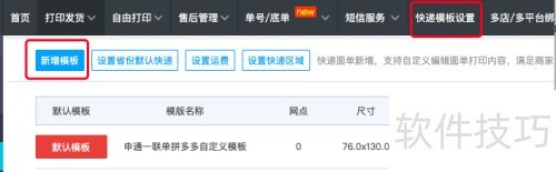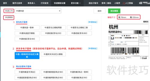 3、 进入传美打印页面,新增快递单模板。选择快递公司与模板类型,如一联单或二联单,并依据打印纸尺寸设置对应模板。