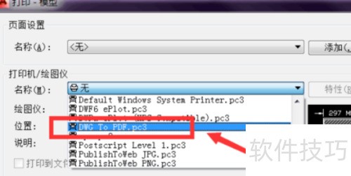 1、 按照提示选择打印机名称,例中所示的dwG TO pdf打印机。
