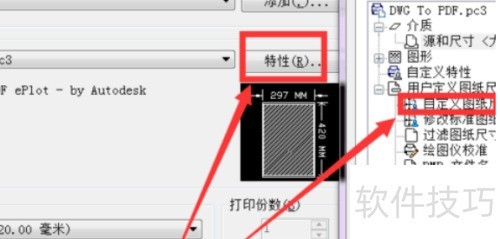 3、 然后在特性界面选择自定义图纸尺寸,点击添加,所示。
