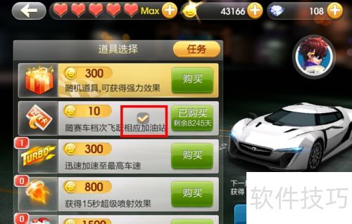 1、 天天飞车加油卡的开启方法:先购飞跃卡,打勾即表示已开启,。小编喜爱飞跃模式。